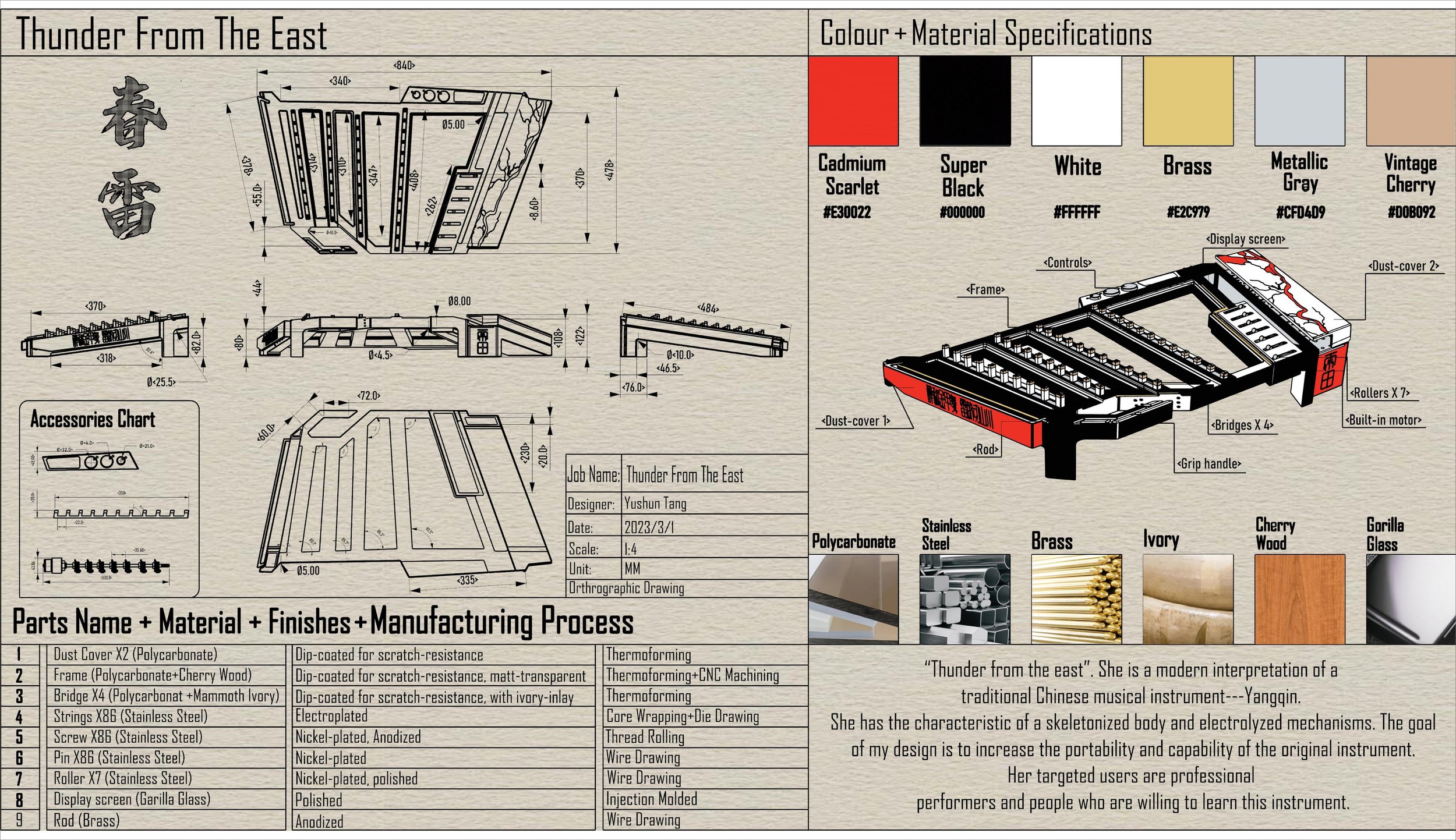 Thunder From The East, she is a modern interpretation of a traditional Chinese musical instrument---Yangqin, with skeletonized body and electrolized mechanisms. Compare to the original model, she has the following unique features:
